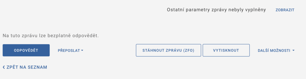 Prostředí datové schránky. Pod zprávou je možnost bezplatně odpovědět na otevřenou zprávu.